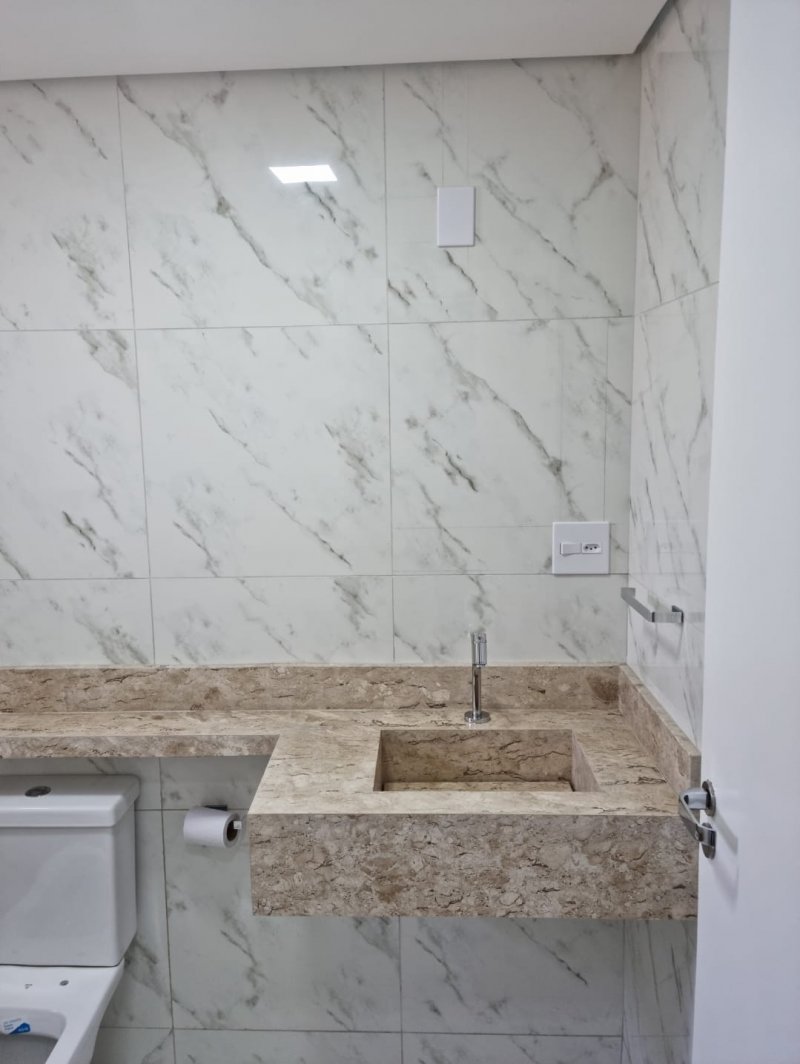 Banheiro: com pia esculpida em mármore travertino. Bacia moderna com tampa com amortecimento. Porta xampu embutido com 50cm X 40cm. Assessórios em alumínio: porta tolhas e papel.