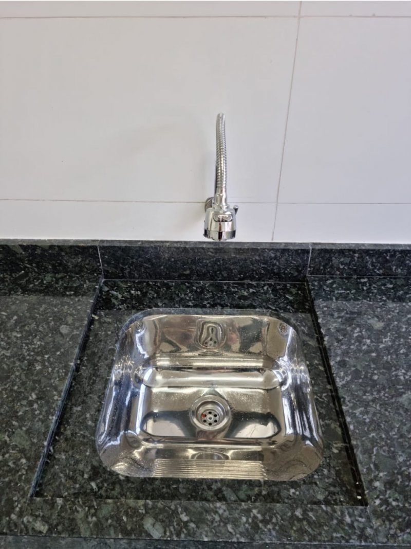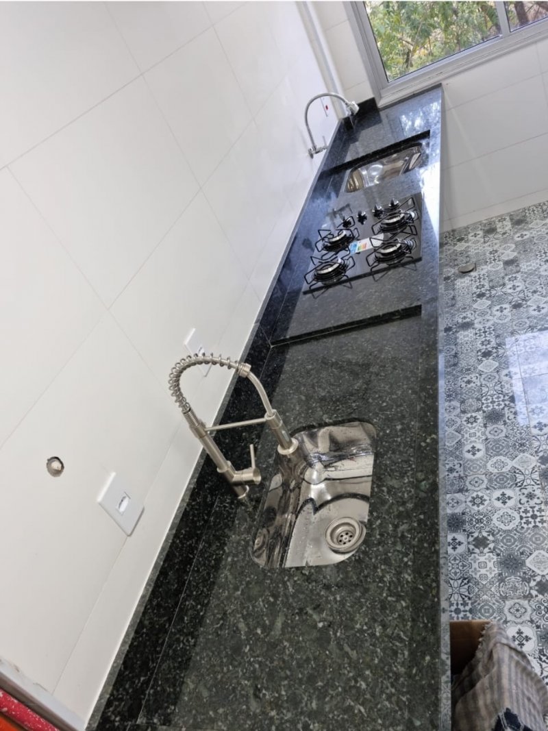 Pia cozinha em granito integrada com o tanque.