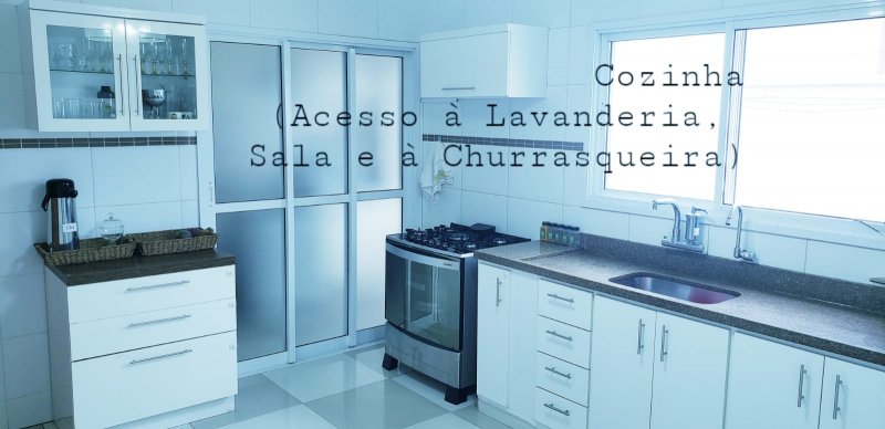 Cozinha ampla com armários planejados, integrada com lavanderia e area de churrasqueira com lavabo.